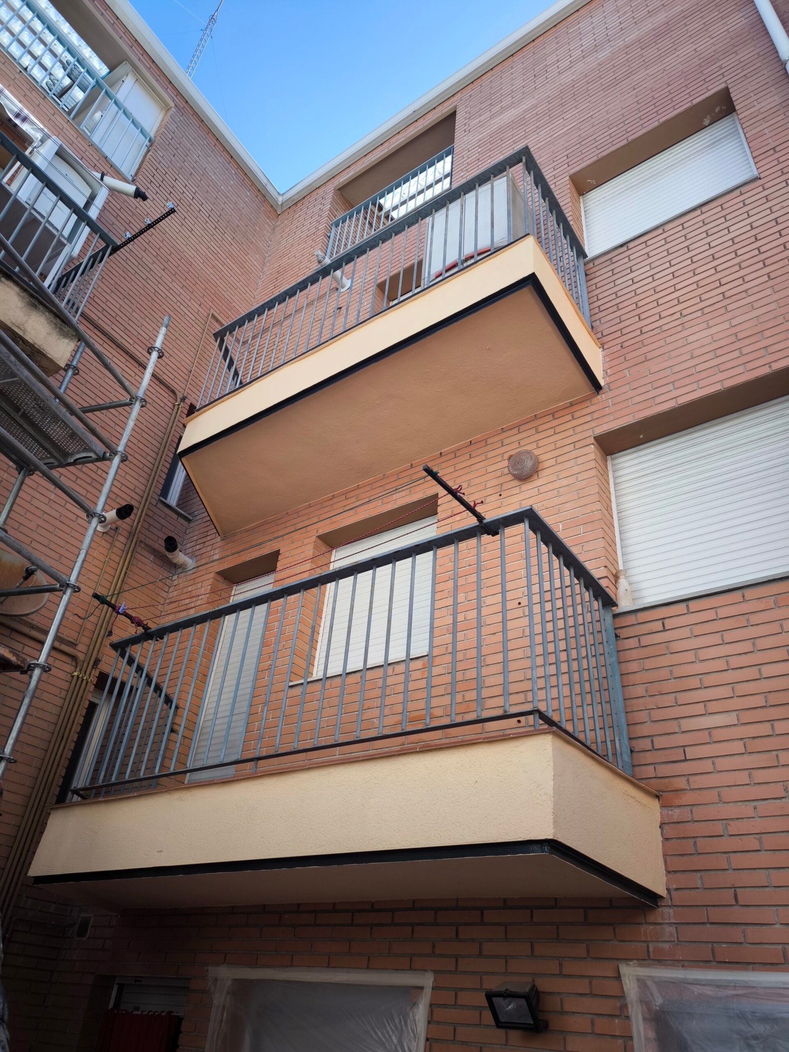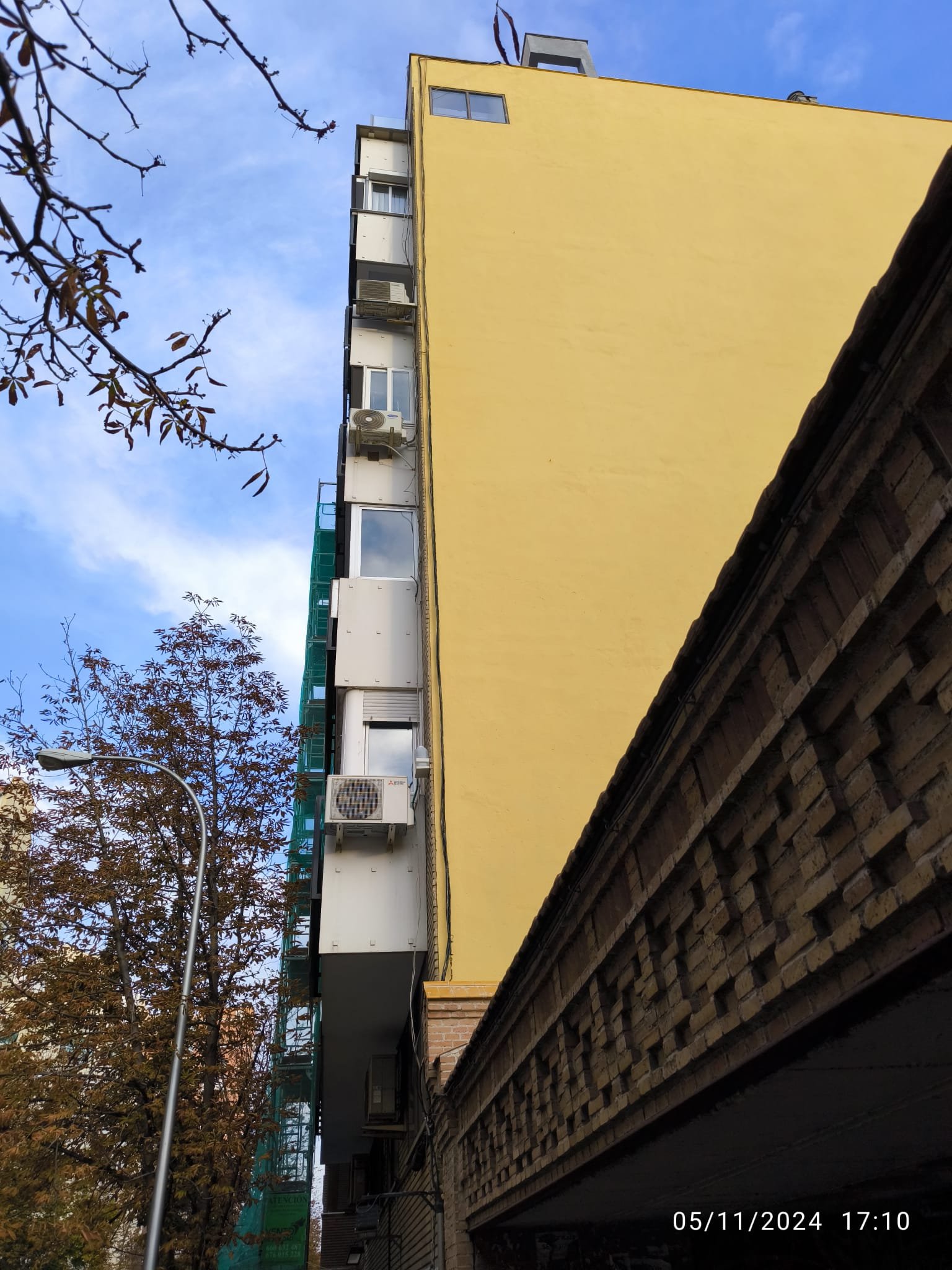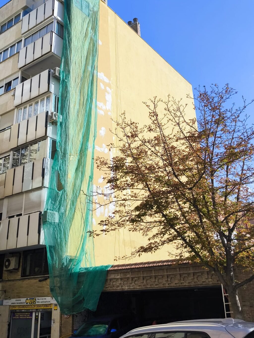 Rehabilitación de fachada medianera mediante picado, zonas abolsadas, grietas, enfoscado y pintura